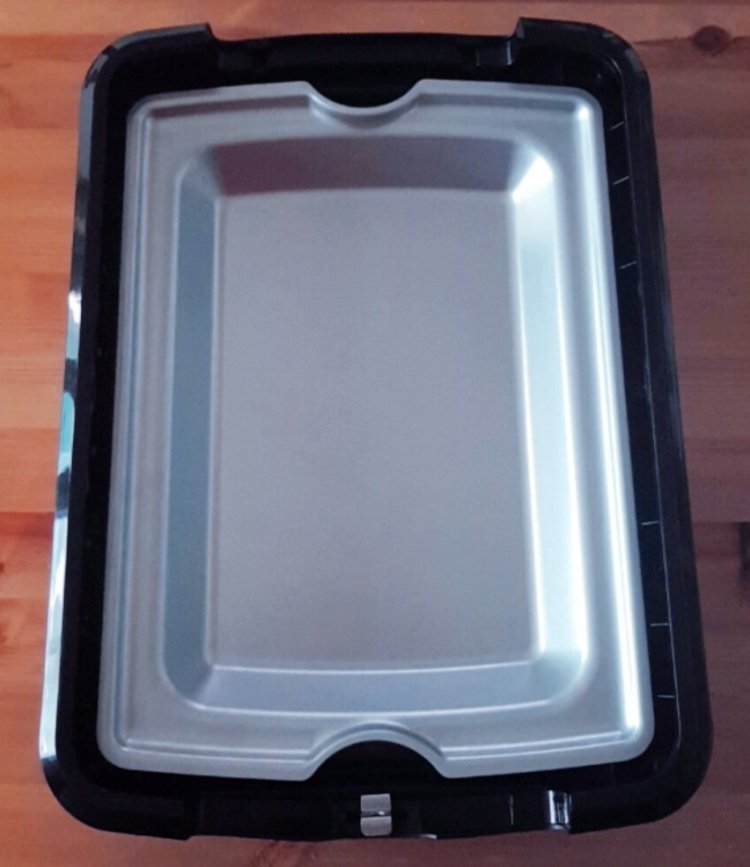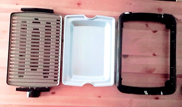 The middle is a tray for receiving the fat, juice or sauce dripping from food, I used to put foils on top, just in cause it sticks, I did it for few times, but one day, I forgot to do so, it didn’t stick, easy to wash off the stain, since then, I never put foils on, you can see it still looks new from the picture I just took.